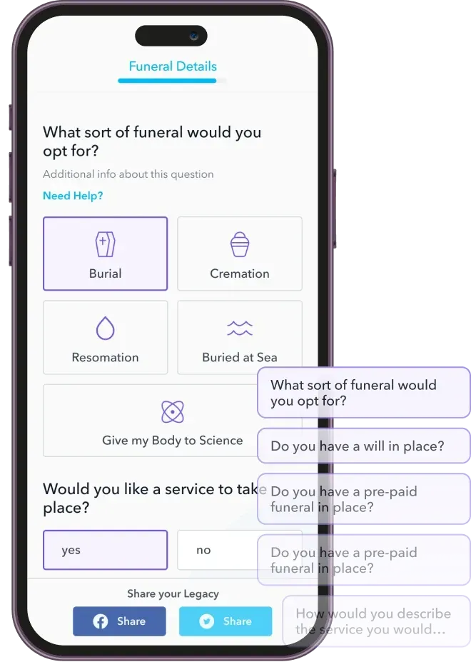 A free online platform for people to capture, store, and share important information. This sparks and stimulates conversations on end of life, legacy and wishes. So, when someone dies, the journey for the remaining family and friends is softened and memories are stored.